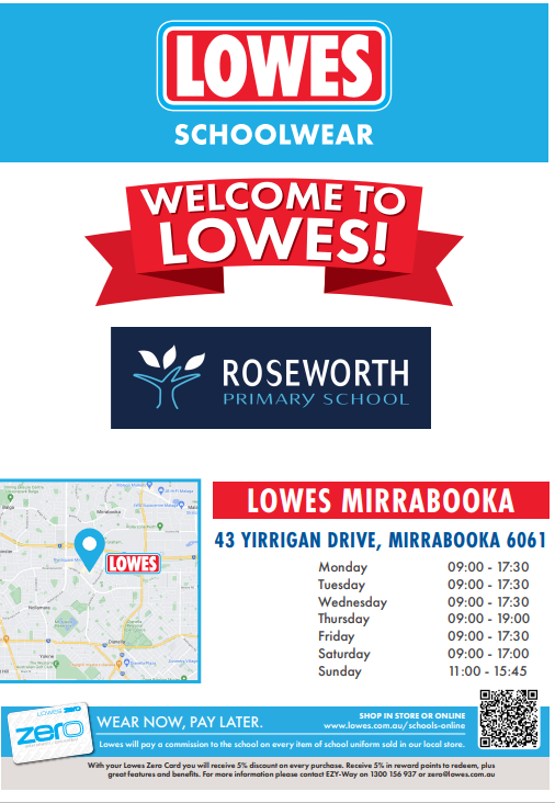 At Roseworth Primary School we believe the school uniform for students plays an important role in promoting a positive image and creating a sense of identity, belonging and community among students. Uniforms can be purchased from Lowes Mirrabooka.